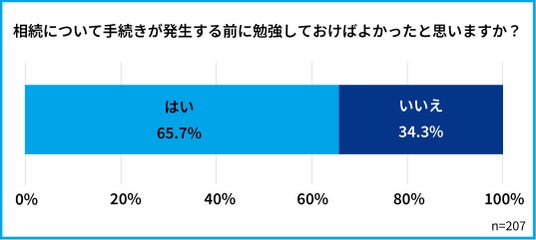 「相続について手続きが発生する前に勉強しておけばよかったと思いますか?」と質問したところ、「はい」と答えた方が65.7%、「いいえ」と答えた方が34.3%という結果になりました。