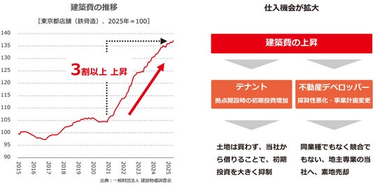 近年、建設費が人件費や資材価格の高騰により大幅に上昇しています。事業会社は新規拠点開設における初期投資の負担が増加しています。また、不動産デベロッパー各社においても、開発プロジェクトの見直しによる、素地売却といった動きが顕在化しています。