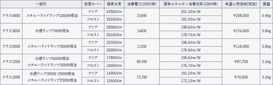 この度のモデルチェンジでは、一般形・オイルミスト対応形、それぞれ5種類のあかるさクラス(4000・3000・2000・1500・1000)を対象に、大幅な節電に貢献する高効率化を実施しました。