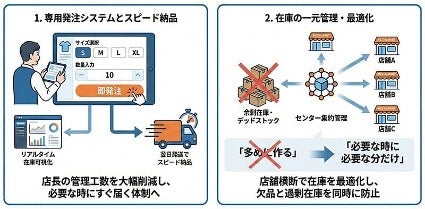 追加発注を必要分のみにすることで在庫ロスが解消され、年間40万円かかっていた費用は、30万円まで縮小。これにより在庫を抱えるコスト構造から脱却し、必要な時に必要な分だけを回す効率的な運用体制へと転換することができました。また、専用発注システムの構築により、店長が在庫管理や発注作業に費やしていた時間は、月40時間から月10時間へと大幅に短縮。その結果、30時間×2,000円×12か月=年間72万円の人件費削減が可能となりました。