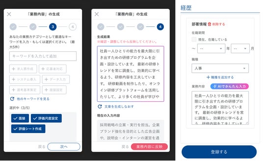 ■新機能「プロフィール自動生成機能」はキーワードを選択するだけで、充実した経歴文章を自動生成