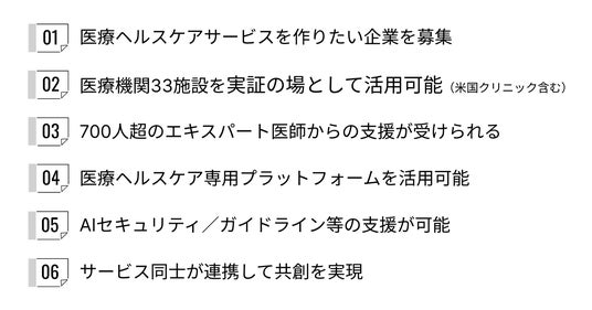ドクターズは、国内外あわせて33の医療機関を本プロジェクトにおける実証・検証の場として提供し、実際の医療現場でAIサービスを磨き上げていきます。これらの医療機関には日本国内のみならず、アメリカのクリニックも含まれており、グローバル展開を見据えた医療ヘルスケアAIの社会実装が可能です。リアルな医療現場での検証を前提とすることで、「使われるAI」「続くAI」「広がるAI」を生み出していきます。
