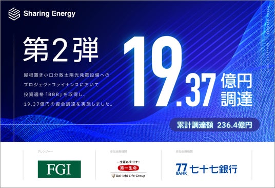 株式会社シェアリングエネルギー(本社:東京都港区、代表取締役:上村一行、以下、シェアリングエネルギー)は、2,000件超の住宅を中心とした屋根置き低圧分散型太陽光発電システムをもとにしたプロジェクトファイナンス(以下、本プロジェクトファイナンス)について、フィンテック グローバル株式会社をアレンジャーとし、株式会社格付投資情報センターからBBBの格付を取得した上で、第一生命保険株式会社、株式会社七十七銀行から計19.37億円の資金調達を実施いたしました。屋根置き低圧分散型太陽光発電システムへのプロジェクトファイナンスとして前回に続き、第2弾の格付取得であり、格付が付与された形での資金調達手法が確立されました。今回の資金調達により、シェアリングエネルギーの累計資金調達額は236.4億円となりました。