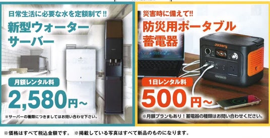 便利なウォーターサーバーや防災用ポータブル蓄電器レンタル(1日500円~)も対応しています。