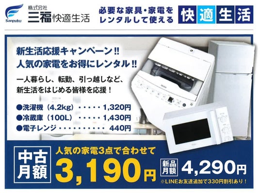 三福快適生活より、転勤・単身赴任の方に最適な洗濯機・冷蔵庫・電子レンジなど人気家電を月額レンタル可能。