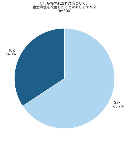 冬場の肌荒れ対策として、寝室環境を改善したことがあるか調査したところ、「ある」と回答した方は34.3%にとどまりました。多くの方が朝の肌乾燥を実感し、寝室の冷え込みとの関連性を感じているにもかかわらず、実際に寝室環境を改善するまでには至っていない実態が明らかになりました。