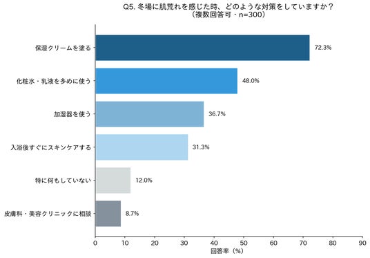 冬場に肌荒れを感じた時、どのような対策をしているか調査しました(複数回答可)。最も多かったのは「保湿クリームを塗る」で72.3%、次いで「化粧水・乳液を多めに使う」が48.0%、「加湿器を使う」が36.7%という結果になりました。一方、「皮膚科・美容クリニックに相談」は8.7%にとどまり、専門家への相談は少ない傾向が見られました。