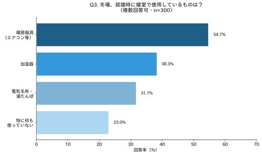 冬場、就寝時に寝室で使用しているものについて調査しました(複数回答可)。最も多かったのは「暖房器具(エアコン等)」で54.7%、次いで「加湿器」が38.3%、「電気毛布・湯たんぽ」が31.7%という結果になりました。一方、「特に何も使っていない」という回答も23.0%あり、寝室の冷え対策を行っていない層も一定数存在することが分かりました。