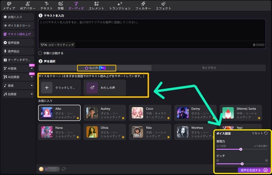 さらに既存のボイスライブラリも語調や感情を調整して個性的に使えるため、自分だけのオリジナル音声表現が実現できます。例えば、YouTube動画や教材で自分の声を使いたい場合にも最適です。