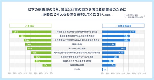 「子育てと仕事の両立に必要な制度」を尋ねた結果、人事担当者は「始業時刻等の変更(84%)」「短時間勤務(75%)」に回答が集中。一方、従業員は「テレワーク(44%)」「休暇付与(41%)」など幅広く回答が分散しました。