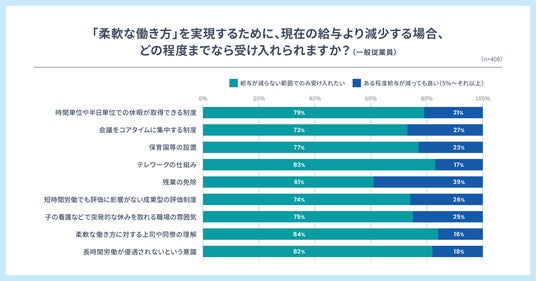 今回の従業員の回答では、多くが「給与が減らない範囲で柔軟な働き方を望む」と答える一方で、「減収してでも柔軟な働き方を実現したい」という声も一定数見られました。