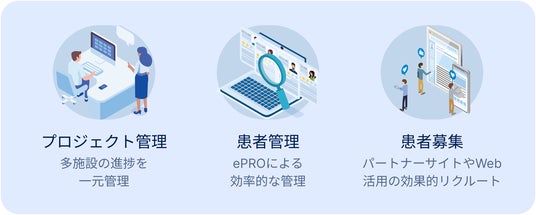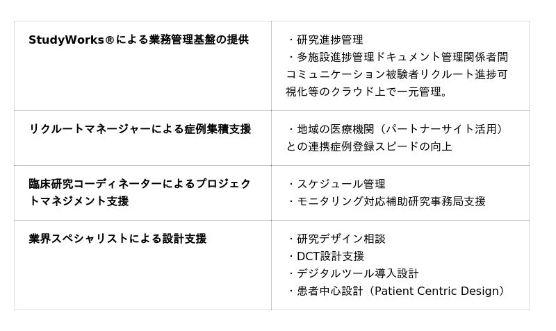 本サービスでは、当社が提供する治験・臨床研究支援プラットフォーム「StudyWorks(R)︎」を基盤に、リクルートマネージャーによるパートナー医療機関と連携した症例集積支援、臨床研究コーディネーターによるプロジェクトマネジメント支援、業界スペシャリストによる研究設計相談やDCT(分散型臨床試験)設計支援や、地域連携を活かした産学官患連携の強化などのサポート体制を提供いたします。