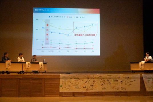 最初の講演「まち全体が、教育環境~こどもにやさしいまちを目指した挑戦~」では、及川秀一郎町長と井内聖教育長が登壇し、「子育て・教育」を軸とした施策に取り組んだ7年間を振り返りました。2018年の北海道胆振東部地震で被災し、人口減に。震災からの復興に取り組みながら、行政・教育・民間が一体となって「日本一の公教育」を目指してさまざまな取り組みをした結果、2022年から3年連続社会増を達成しました。