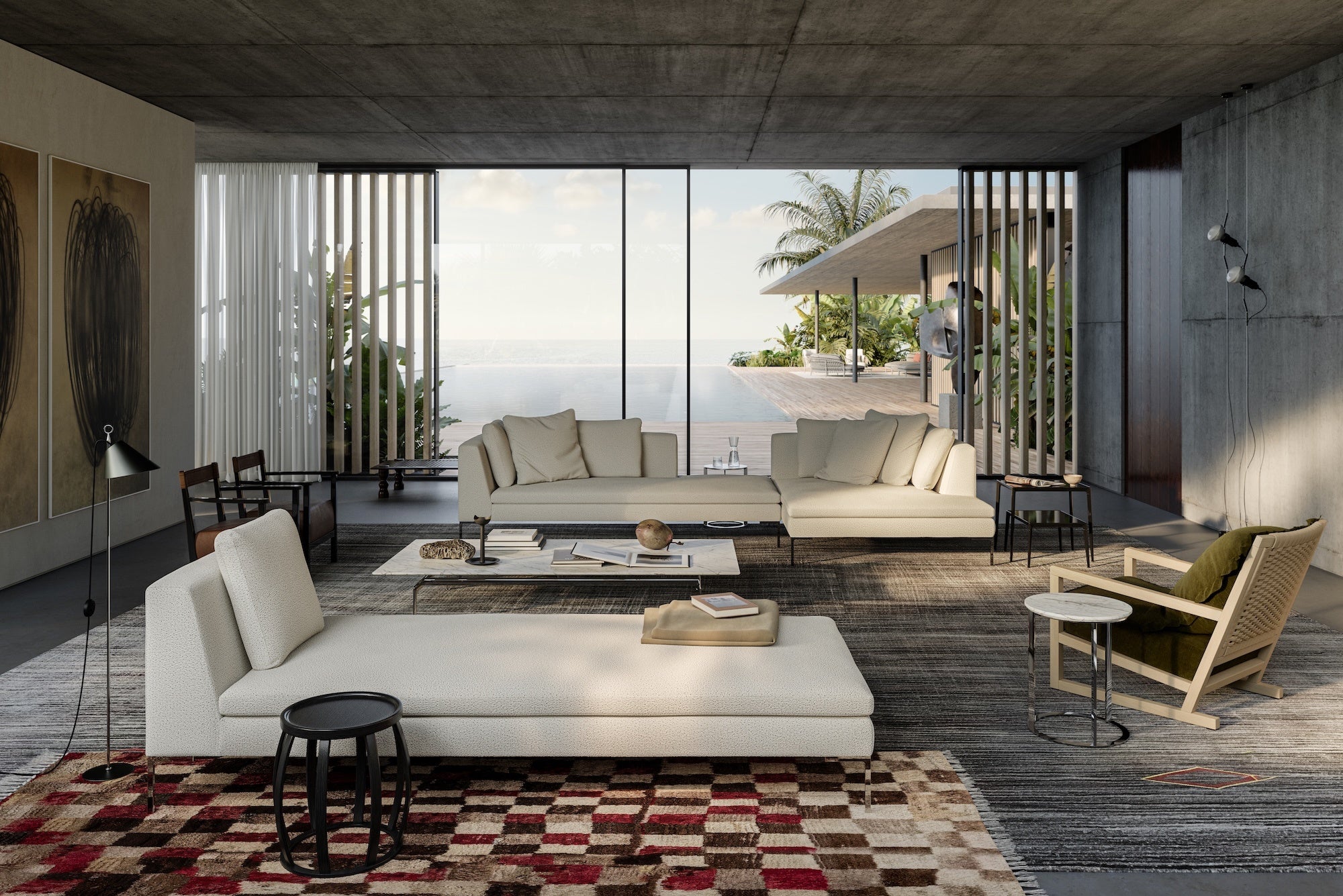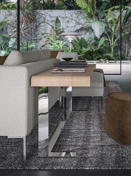 逆L字脚が生む浮遊感と軽やかな構造美はそのままに、ベンチやデイベッド、さらにローテーブルやコンソールを展開し、空間提案の幅を拡張。多彩な張地と高い構成自由度により、現代のライフスタイルに寄り添うコレクションへと進化しました。