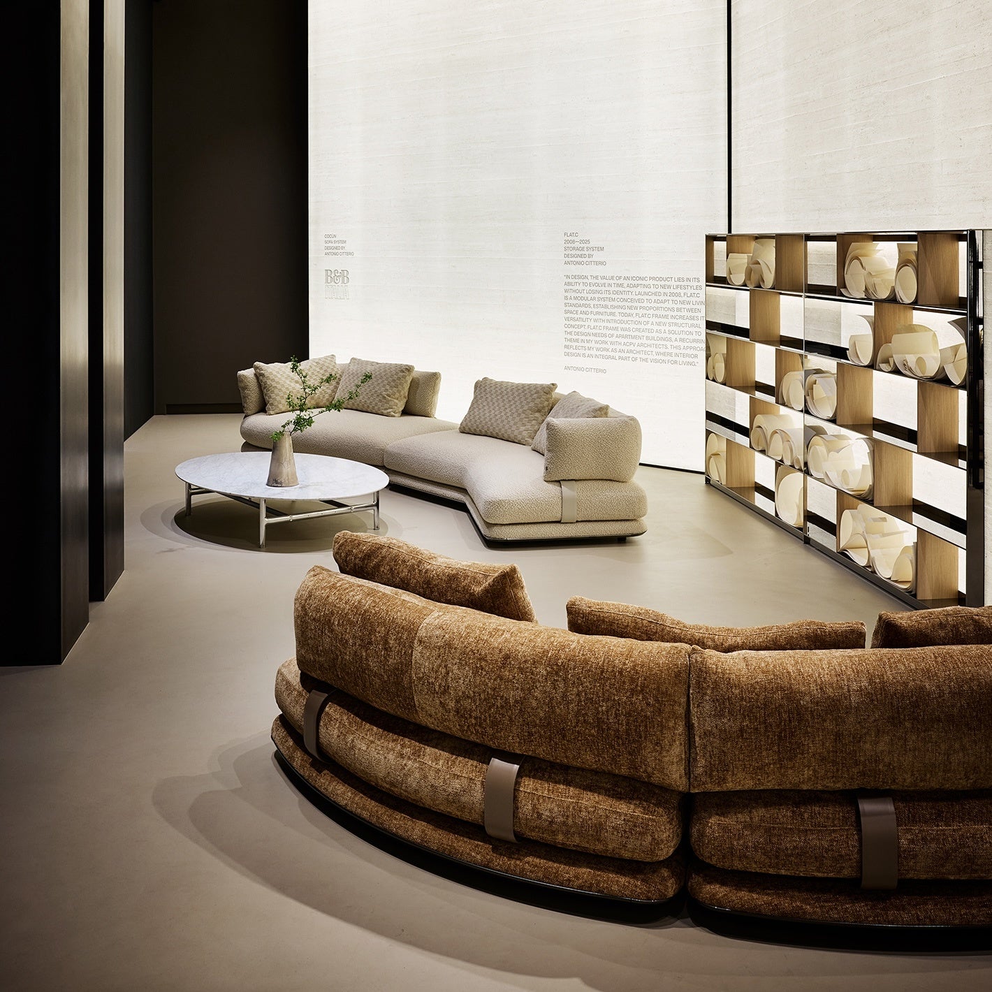 さらに、アントニオ・チッテリオによる収納システム<Flat.C(フラット シー)>が進化し、<Flat.C Frame(フラット シー フレーム)>として登場。ブックシェルフ兼収納ユニットに新たな構造コンセプトを導入し、自立型の建築的ソリューションへと生まれ変わりました。