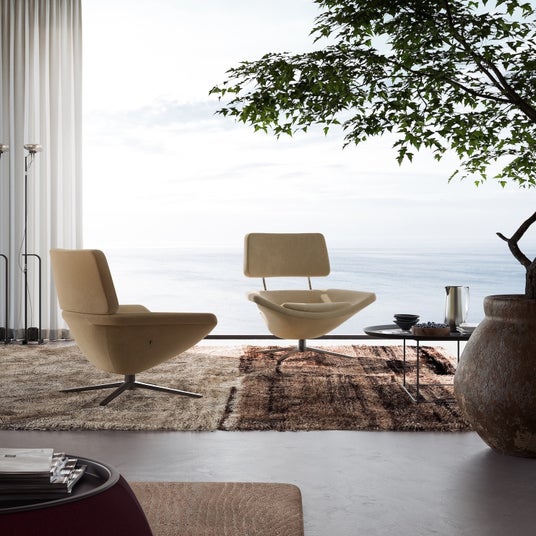 ブラッシュドポリッシュアルミニウムまたはブロンズニッケルのフレームに、多彩なファブリックやレザーを組み合わせ、住宅からホスピタリティ、オフィスまで幅広く調和。“読む・観る・休む”ための、日常に安らぎをもたらすラウンジチェアです。