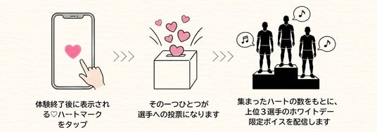 2月14日(土)~2月28日(土)の投票期間にタップされたハートマークの数を集計し、上位3名の選手を選出。選ばれた選手による「ホワイトデー限定ボイス」の配信を決定する、ファン参加型の投票企画を展開いたします。