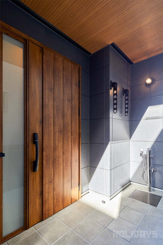 サーフィンが趣味のお施主様がこだわったのは、海で使ったものを帰宅後すぐに洗える玄関ポーチのシャワー水栓。ホスクリーンも完備しているので洗ったものはそのまま外で干すことができます。