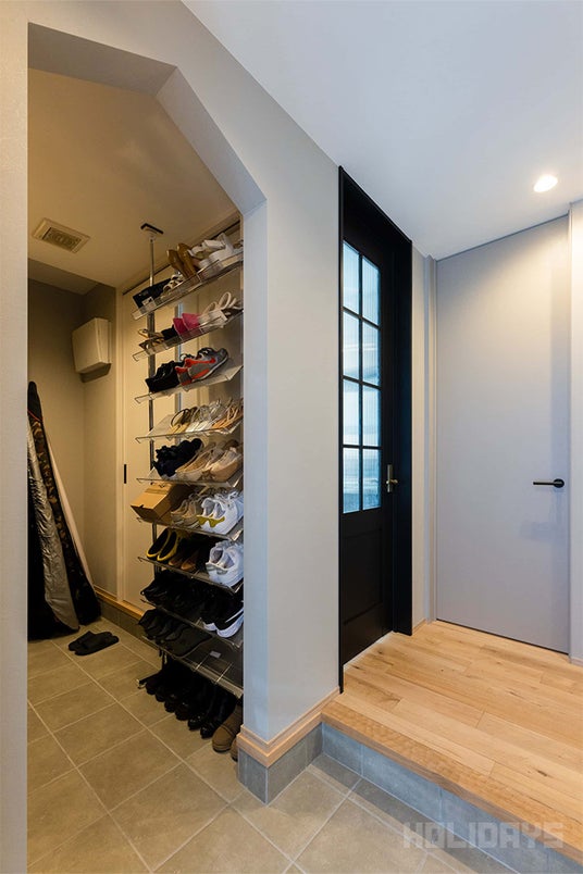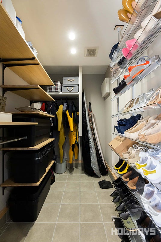 靴は斜めのラックで見せる収納かつ省スペースに。その他サーフボードやウェットスーツもサイズに合わせて設計したことで収納も楽々。シューズインクローゼットの上部は三角形の垂れ壁でかわいらしさを演出しています。