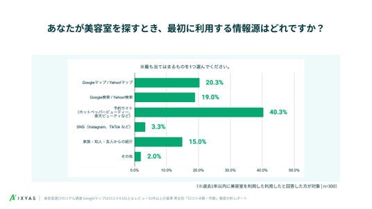 前頁の設問「過去1年以内に美容室を利用した」と回答した2,163人の中から300人に対し追加調査行った。最も多く利用された情報源は「予約サイト(ホットペッパービューティー、楽天ビューティなど)」(40.3%)で、「Googleマップ / Yahoo!マップ」が20.3%、「Google検索 / Yahoo!検索」が19.0%と続いた。予約サイト経由が主流でありつつも、Google/Yahoo!マップを利用する層も一定数見受けられた。