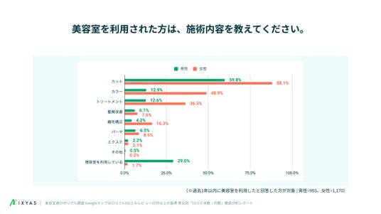 男女ともに「カット」が最多となった。全体として、各施術内容について女性が男性を上回っており、女性は複数のメニューを複合的に利用していることがわかる。男性の29.0%は理容室を利用しており、その利用にはカット施術も含まれていると考えられる。