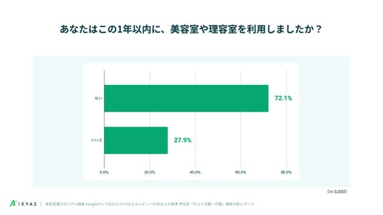 21歳~59歳の男女3,000人を対象に「この1年以内に美容室や理容室を利用しましたか?」と尋ねたところ、「はい」(72.1%)、「いいえ」(27.9%)となった。