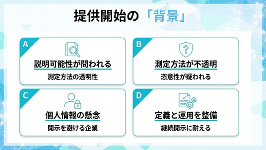 測定負荷と個人情報リスクを抑えつつ、継続開示に耐える説明可能性を構築します。