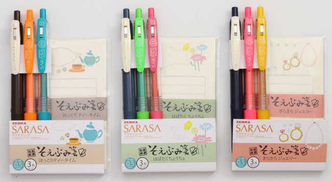 2.それぞれの「そえぶみ箋」のデザインに合わせて、46色のカラーバリエーションをもつ『サラサクリップ』から3色をチョイスしています。上司や友だちへのメッセージなど、さまざまなシーンに使えるサラサクリップ3色を選びぬいています。