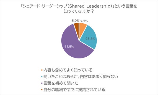 「シェアード・リーダーシップ(複数人が状況や役割に応じてリーダーシップを発揮するスタイル)」という言葉についての認知度をたずねたところ、「言葉を初めて聞いた」が全体で61.5%となりました。一方で、「内容も含めてよく知っている」7.7%、「聞いたことはあるが内容はあまり知らない」25.8%、「自分の職場ですでに実践されている」5.0%を合計すると、理解度の濃淡はあれど認知している層は38.5%にとどまります。