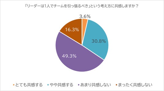 「リーダーは1人でチームを引っ張るべき」という考え方に対し、「とても共感する」「やや共感する」は合計で34.4%にとどまりました。一方で、「あまり共感しない」「まったく共感しない」は65.6%となり、単独の“強いリーダー像”に依存しない価値観が広がっていることがうかがえます。