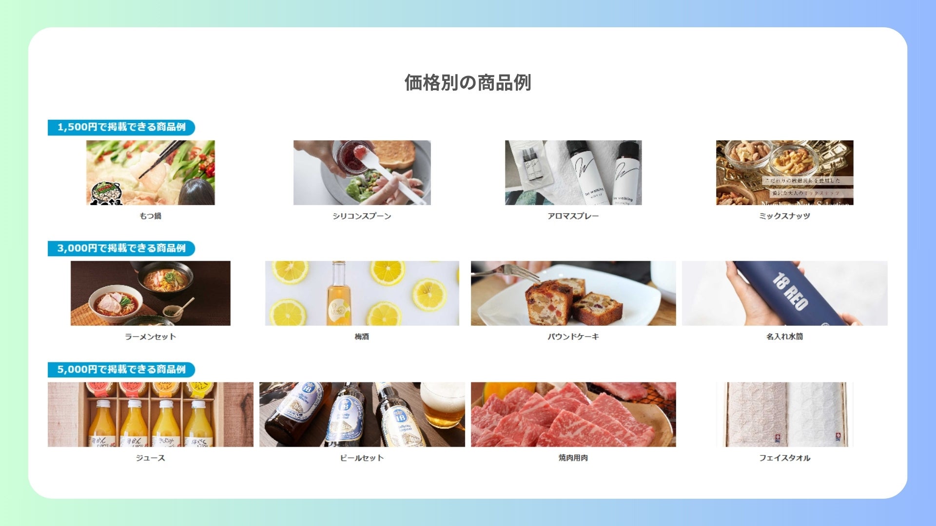 オリジナルeカタログギフトに掲載可能な商品は、食品・ドリンク、スイーツ、生活雑貨から電化製品、ペットグッズ、名入れ商品等、全17カテゴリ・1万点以上。