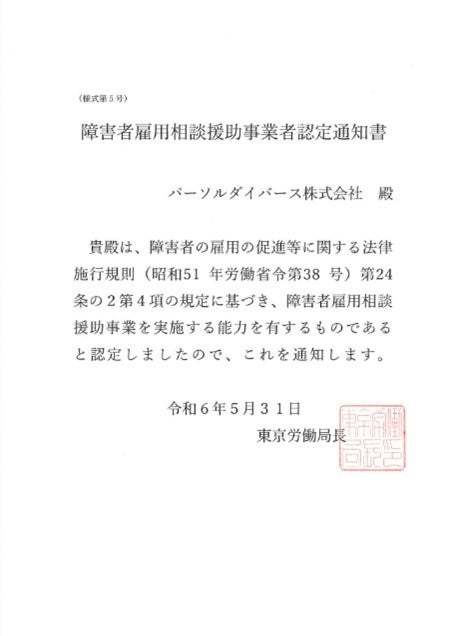 障害者雇用相談援助事業者認定通知書(パーソルダイバース)