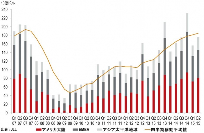 総合不動産サービス大手のJLLグループ(本社:イリノイ州シカゴ、社長兼最高経営責任者:コリン・ダイアー、NYSE JLL、以下:JLL)がまとめた投資分析レポートによると、2015年第2四半期の世界の商業用不動産投資額は、前年同期比9%増の1,770億ドル※1、2015年上半期の投資額は、前年同期比9%増の3,330億ドルとなりました。JLLは、2015年の世界の商業用不動産投資額の見通しを7,400-7,600億ドルとしています。
