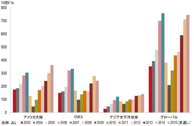2015年通年の世界の商業用不動産投資額は、このペースで推移すれば2007年と同レベルの7,600億ドルになる可能性があるものの、投資物件の不足がみられることなどから、投資額は7,400-7,600億ドルと予測している。(図表4)