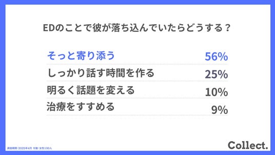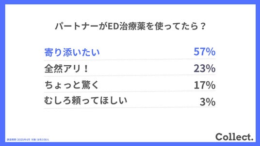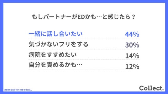 ディーエムソリューションズ株式会社(東証スタンダード上場)が運営するメディア「Collect.(コレクト)」では、女性100人を対象に、男性のEDに関するアンケート調査を実施しました。