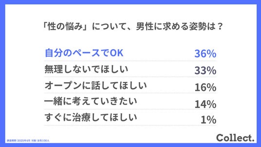 - 「性の悩み」について男性に求めるのは、“無理せず自分のペースで”が最多