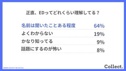 「名前は聞いたことある程度」が最多の64%に。十分に理解している層は1割未満にとどまり、EDという言葉は知っていても、詳しい知識の浸透はまだ十分でない現状が見えてきました。