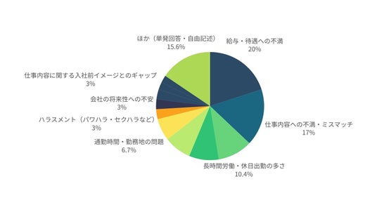 転職を考える理由のトップは「給与・待遇への不満」(21.6%)、次いで「仕事内容への不満・ミスマッチ」(18.4%)が続く。