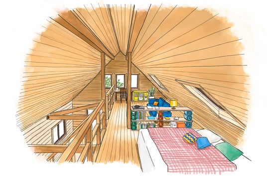 ログハウスならではの斜め天井と天窓がポイントの、秘密基地のようなロフトスペース。