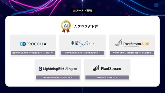 BIMを誰でも直感的に扱えるように設計されたRevit向けプラグイン群「Lightning BIM」シリーズをはじめ、近年はM&Aを通じて「PlantStream(R)」「BUILD一貫シリーズ」「現場ナビ工程」「申請くんfシリーズ」などの製品をグループに加え、建設業界が抱える構造的な課題をテクノロジーの力で解決しています。