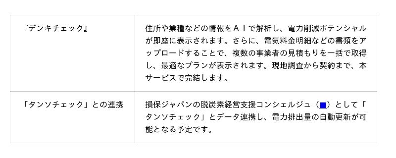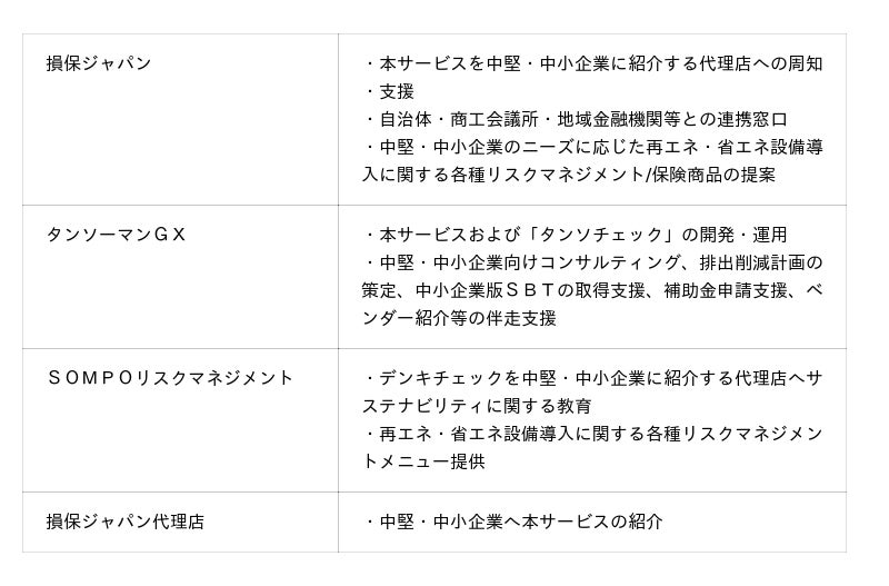 こうした状況を受け、損保ジャパン、SOMPOリスクおよびタンソーマンGXは、損保ジャパンの代理店ネットワークや地域ネットワーク(自治体・商工会議所・地域金融機関などとの連携)を活用し、「中堅・中小企業のコスト削減+排出量削減」の両立を、実効性の高い方法で支援する『デンキチェック』サービスを新たに展開してまいります。
