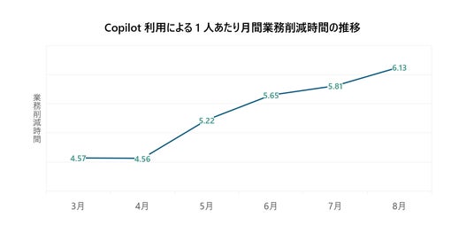 アクティブユーザー率は平均95%以上を維持し、月平均利用回数は、第2期当初の11.6日から、7月には15.1日へと増加(*)し、利用率の向上を達成。また、業務時間の削減効果も徐々に高まり、月2時間以上の業務削減時間を達成した社員の割合は98%に達しました。