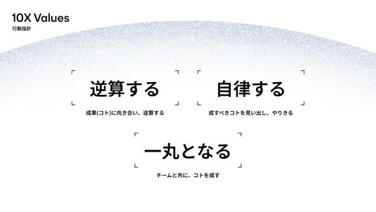 10Xはこの1~2年をかけて事業戦略や組織体制の抜本的な見直しを行う構造改革を行ってきました。直近ではその方向性が定まり、実績も出始めております。自分たちが成果を生み出す行動とは何か、その根底にある価値観はどこにあるのかを改めて振り返り言語化したものが、今回の新たな「10X Values」です。