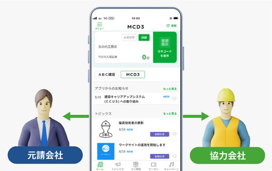 エムシーディースリー株式会社(東京都渋谷区、代表取締役社長:飯田正生)は、2026年4月20日より、元請会社と技能者がデジタルでつながる技能者向けスマートフォンアプリ「Myグリーンサイト」(以下、「本アプリ」)を提供開始いたしました。また、本アプリが技能者の就労意欲向上と現場DXの低コストな実現に効果的であるという期待が寄せられ、前田建設工業株式会社(本社:東京都千代田区、代表取締役社長:前田操治)による「全現場での正式導入」も同時に決定いたしました。