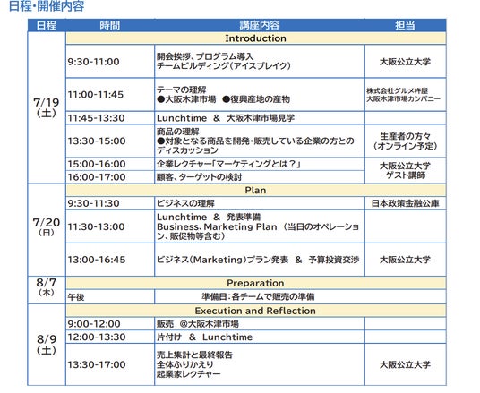その取り組みの第一弾として、大阪公立大学が10年以上にわたり実施してきた「高校生起業家教育講座」の実践の場として、同大学「I-site(アイサイト)なんば」に隣接する大阪府認定の地方卸売市場「大阪木津市場」の朝市においてポップアップ店舗を提供し、高校生が食に関する物販店の経営(販売計画、仕入れ、価格設定、VMD、接客など)を学ぶ機会を創出します。