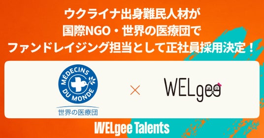 NPO法人WELgee(代表理事:安齋 耀太、以下「WELgee」)は、日本での就労に向けて伴走したウクライナ出身の難民人材が、認定NPO法人 メドゥサン・デュ・モンド ジャポン(本社:東京都港区 / 代表理事:横森佳世氏、以下「世界の医療団」)にてマーケティング部ファンドレイジング(イベント担当)の正規職員として採用されたことを発表します。
