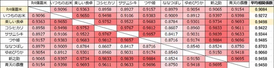 ・平均相関係数は、比較した10品目それぞれについて、他の9品目と「似ているかどうか」の尺度で、1.0に近いほど似ていることになる。