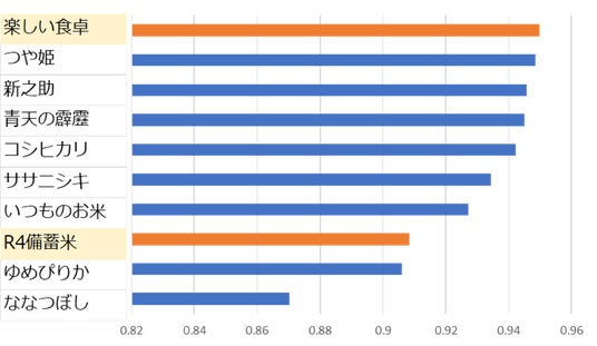 ・備蓄米(下図オレンジ色)と銘柄米の違いは、銘柄米の品種間の違いよりも小さい。