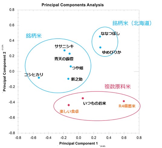 ・下方に分布する3品目はいずれも複数原料米で、備蓄米(下図オレンジ色の品目名)の2サンプルはこのグループに分類された。