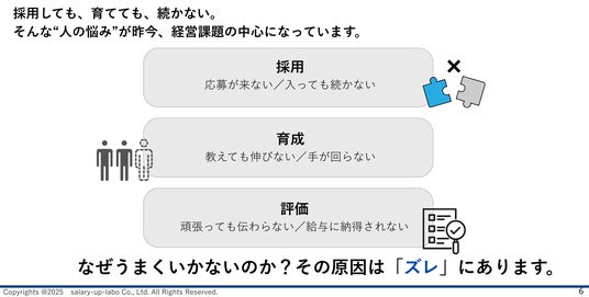 「採用・育成・評価」がつながっておらず、基準がズレていることが、定着しない最大の原因であることが強調されました。